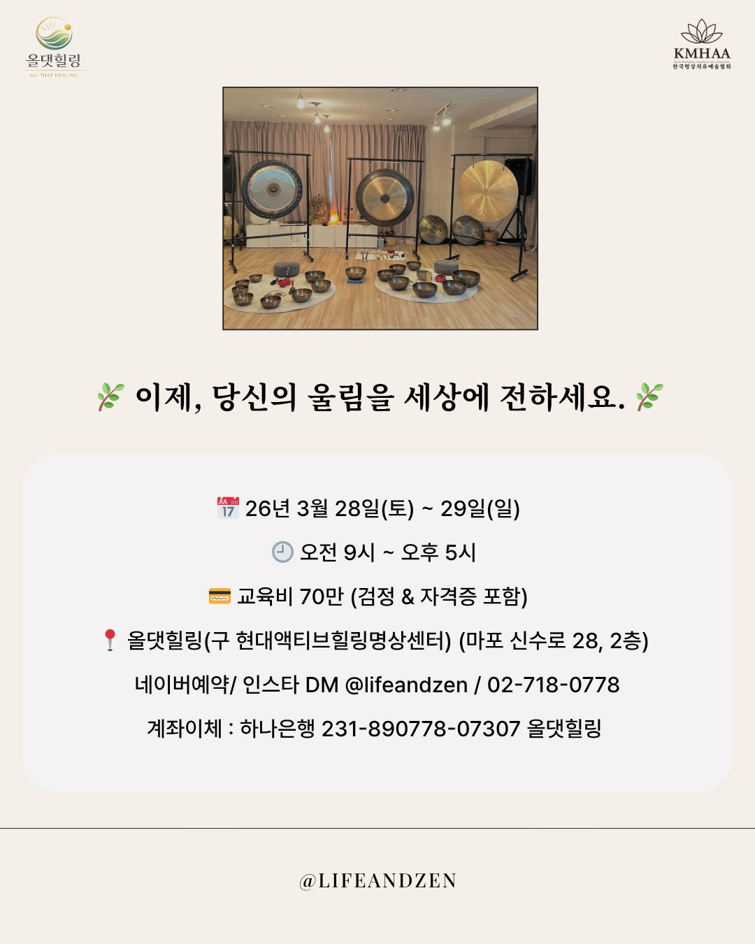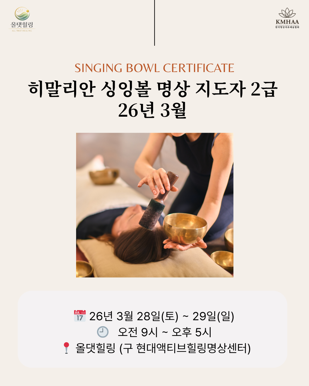 ■ 일정 및 장소 26년 3월 28일 ~ 29일 오전 9시~오후 5시 올댓힐링 (서울 마포구 신수로 28, 2층) 교육비 70만원 (검정 및 자격증 포함)