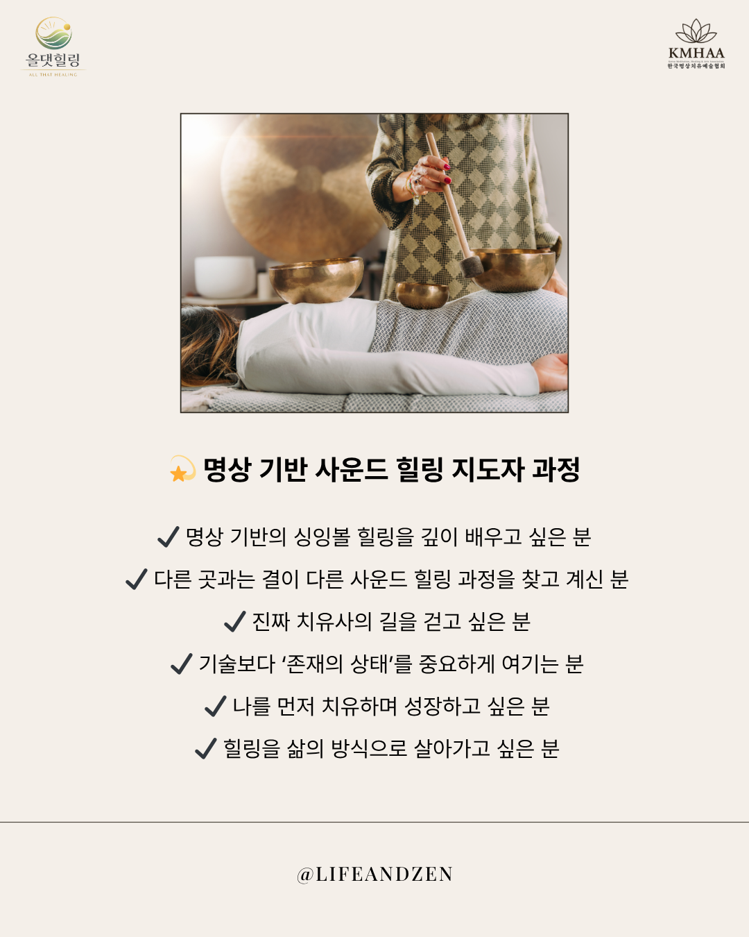 ■ 이런 분께 추천합니다 명상 기반 사운드 힐링을 깊이 배우고 싶은 분 다른 곳과 결이 다른 전문 과정을 찾는 분 기술보다 존재의 상태를 중요하게 여기는 분 힐링을 삶의 방향으로 삼고 싶은 분