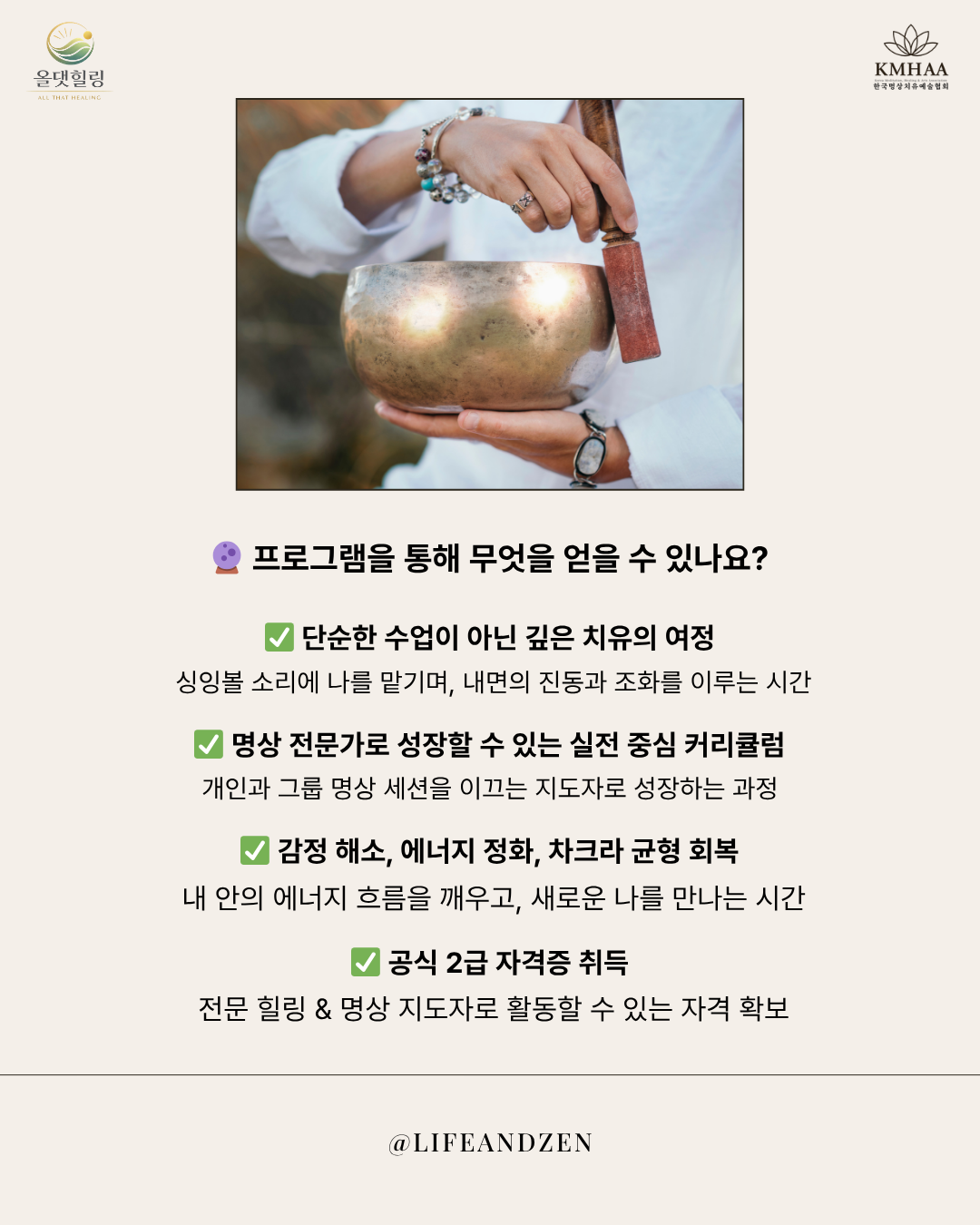 올댓힐링에서는 명상 기반 사운드 힐링을 체계적으로 배우는 히말리안 싱잉볼 명상 지도자 2급 과정을 진행합니다.