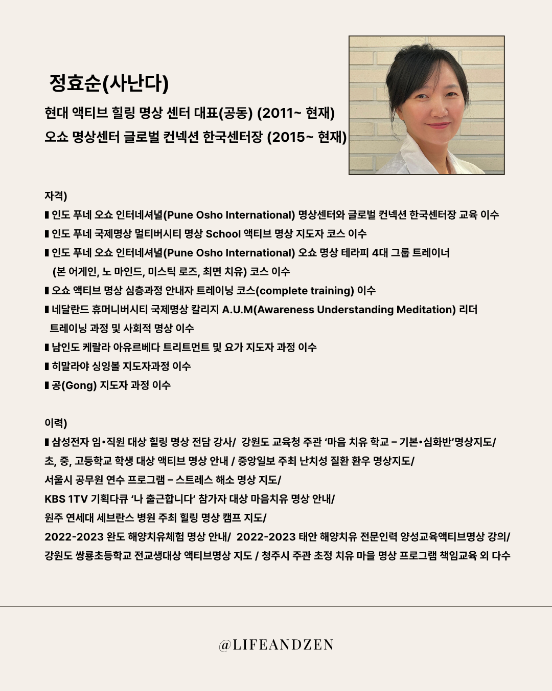 - 다년간 기업·공공기관·병원·학교 등 다양한 현장에서 명상과 힐링 프로그램을 지도해왔습니다.